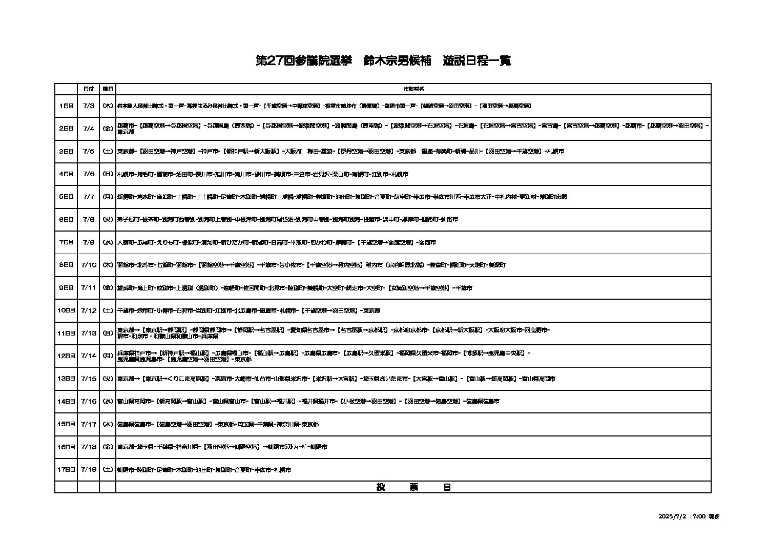 2025鈴木宗男候補遊説日程 こちらからご覧ください※全国各地を廻るため、急遽変更になる場合がございます。【お問い合わせ先】鈴木宗男事務所011-251-5351
